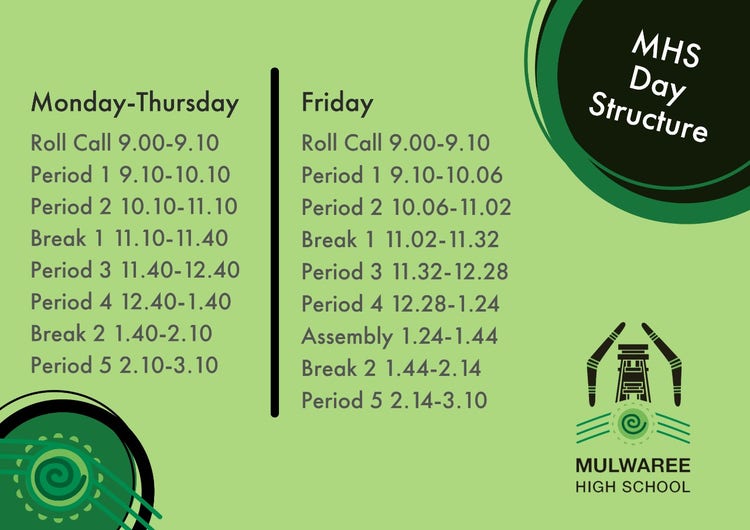 Our school day is structured around a clear timetable. We have set times for learning sessions, activities and lunch. Understanding the bell times helps students get the most out of each part of the day.